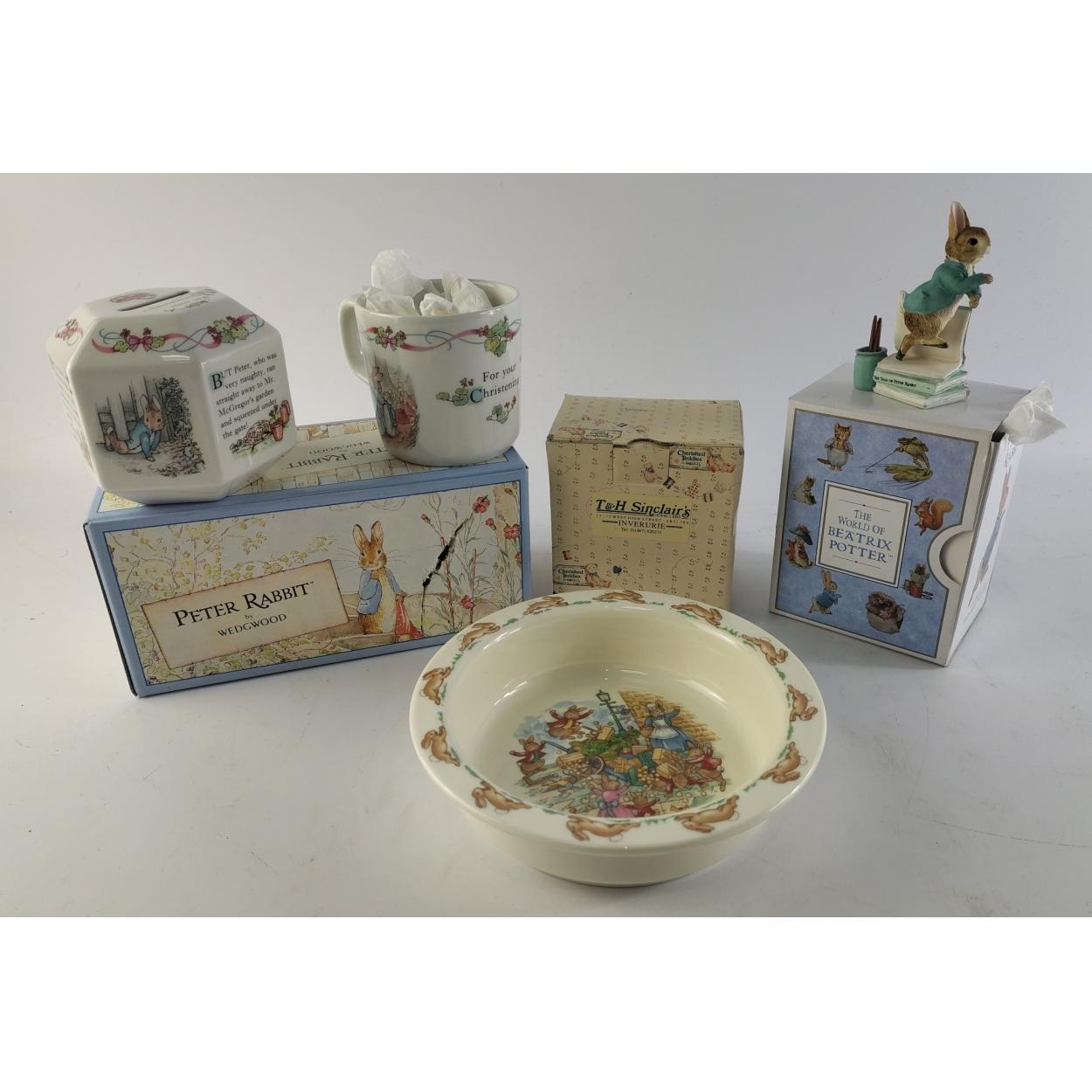 BEATRIX POTTER interest to include WEDGWOOD Peter Rabbit Christening set in box, ROYAL DOULTON bowl, a Peter Rabbit figure and a cherished teddy