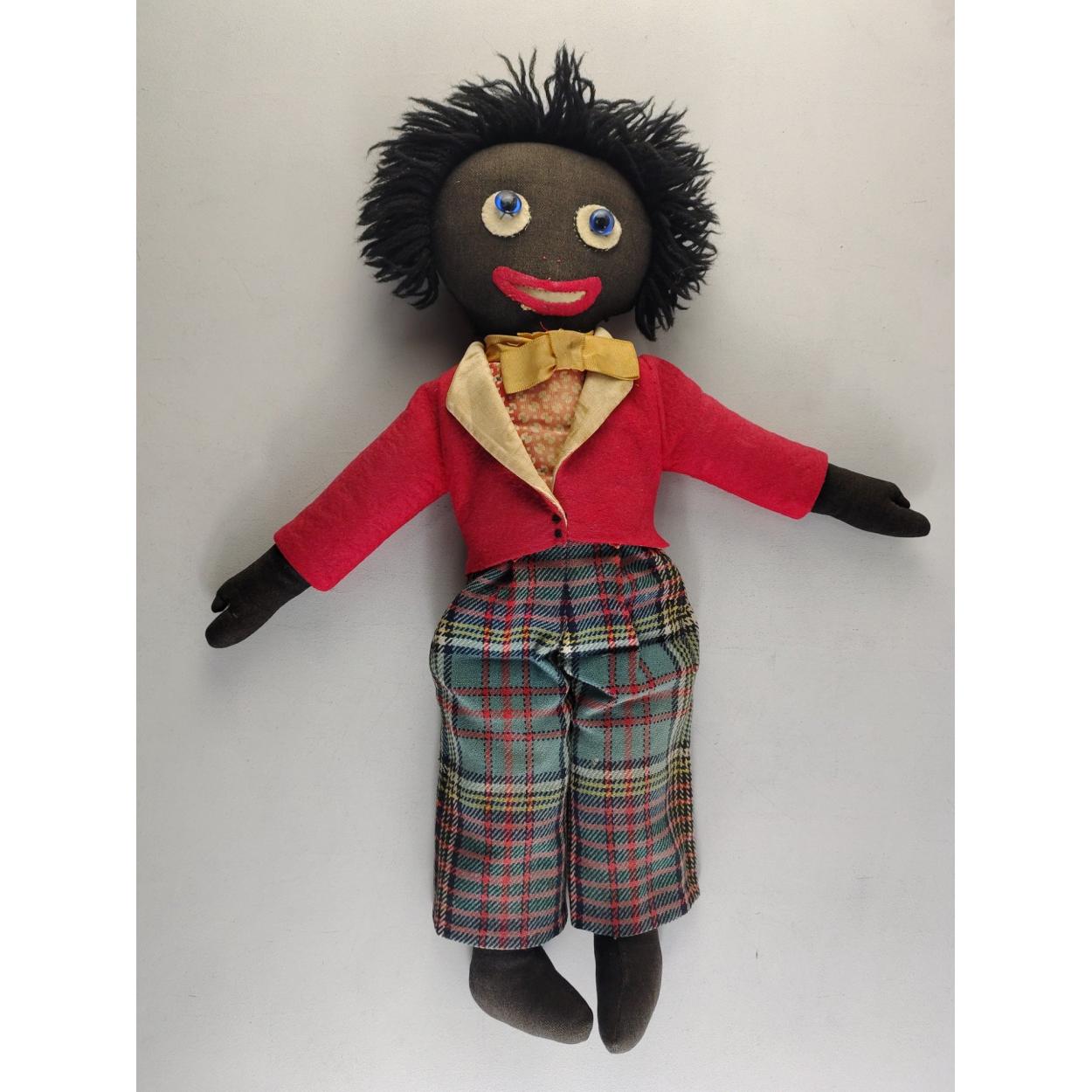 A hand-made golly doll 55cm tall approx. Some moth damage to the rear to the tartan trews.