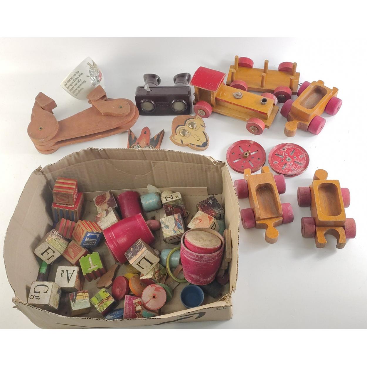 A small box of vintage wooden toys including building blocks, a sausage dog plus a ROMA stereoscope and a WEDGWOOD Peter Rabbit cup.