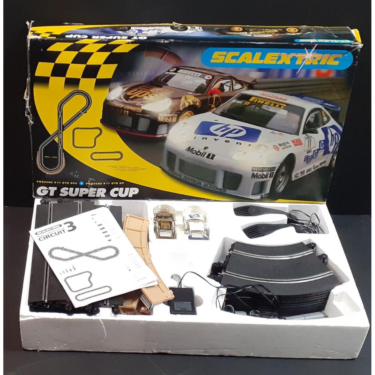 SCALEXTRIC GT SUPER CUP boxed set with track, power and cars. Appears in good well stored condition.