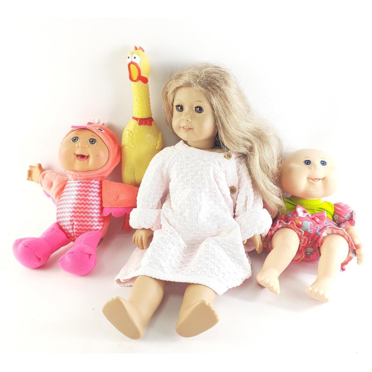 Two CABBAGE PATCH dolls each approx 30cm tall plus a humorous rubber chicken and an AMERICAN GIRL doll approx 47cm tall