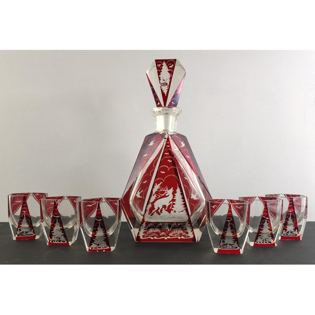 ART DECO Bohemian Czech Ruby red decanter with six cordial shot glasses, believed produced by MOSER. Lavishly decorated with hunting and woodland scenes. Decanter in good undamaged condition, minor historic chips noted to three of the glasses but the set displays beautifully. Decanter stands 26cm approx