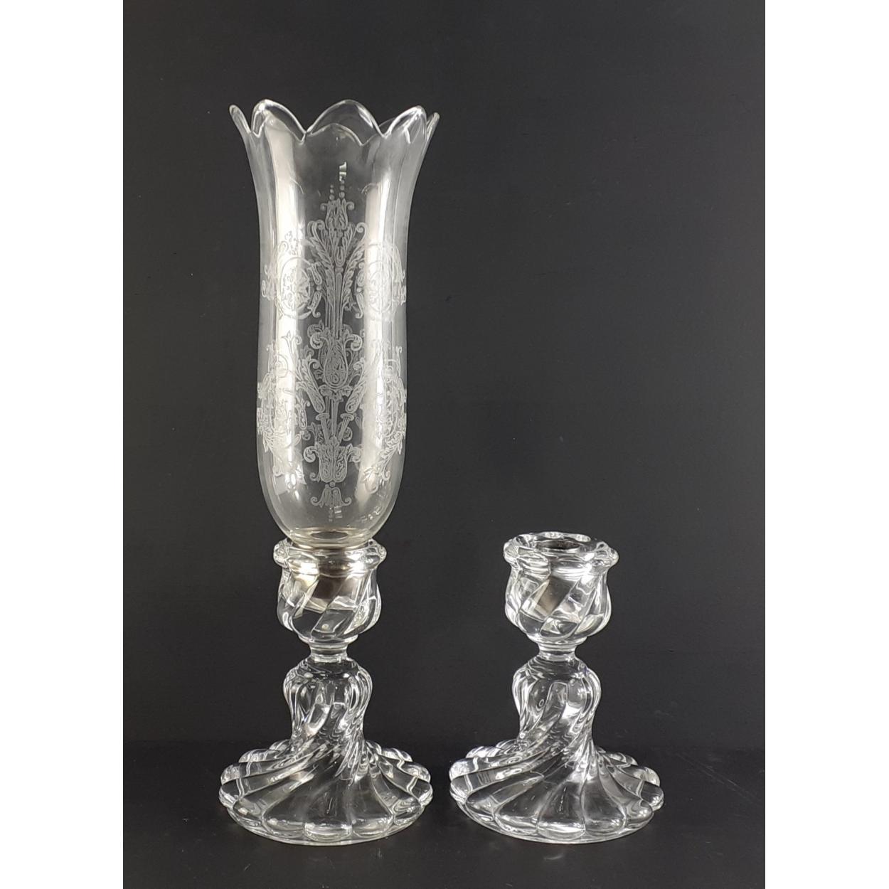 A pair of BACCARAT etched heavy glass candle holders one with funnel. The holders stand 17cm and 40cm approx with funnel. Both in good order. Stylish, quality and quite lovely.