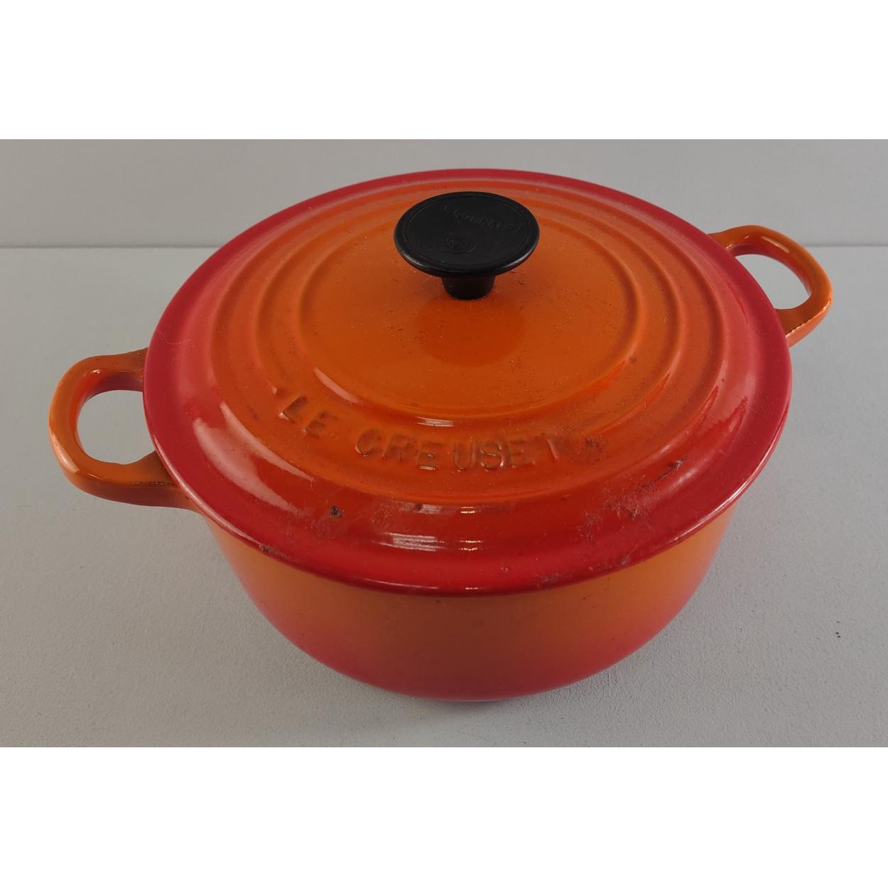 LE CREUSET lidded two handled cast iron casserole dish in volcanic orange. 21cm excl. handles approx.