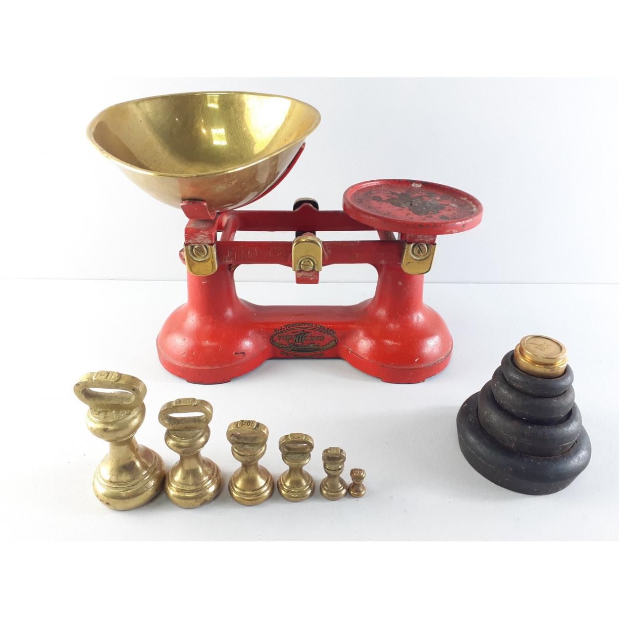 A vintage set of F.J. THORNTON 'The Viking' balance scales with pan and two sets of weights.