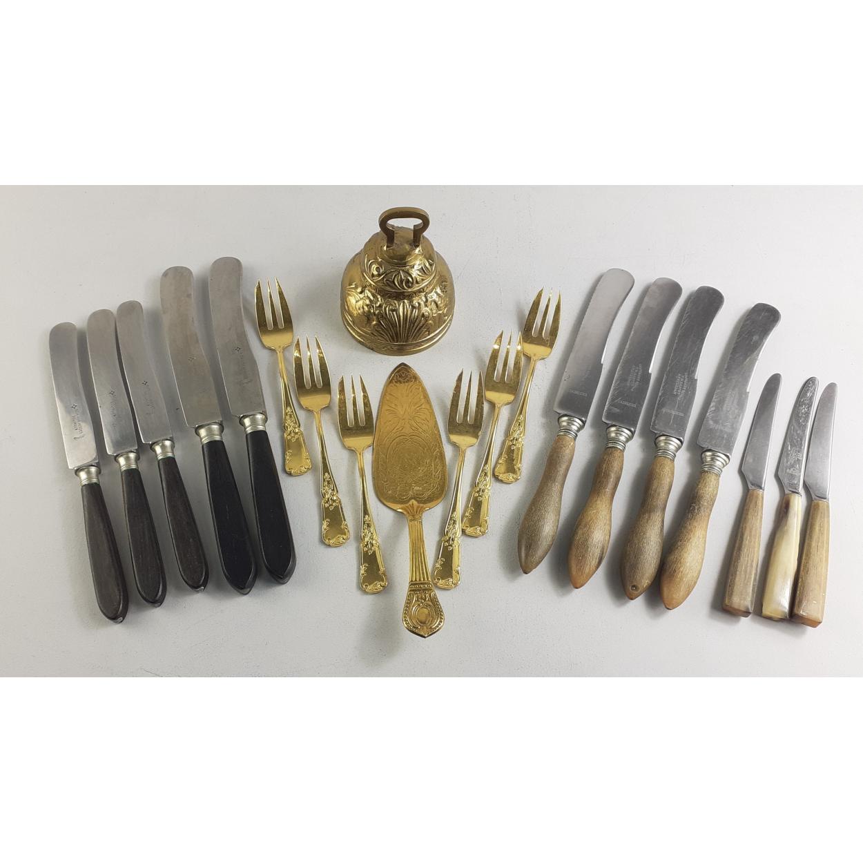 A lot of assorted stainless steel flatware with a small brass handbell.
