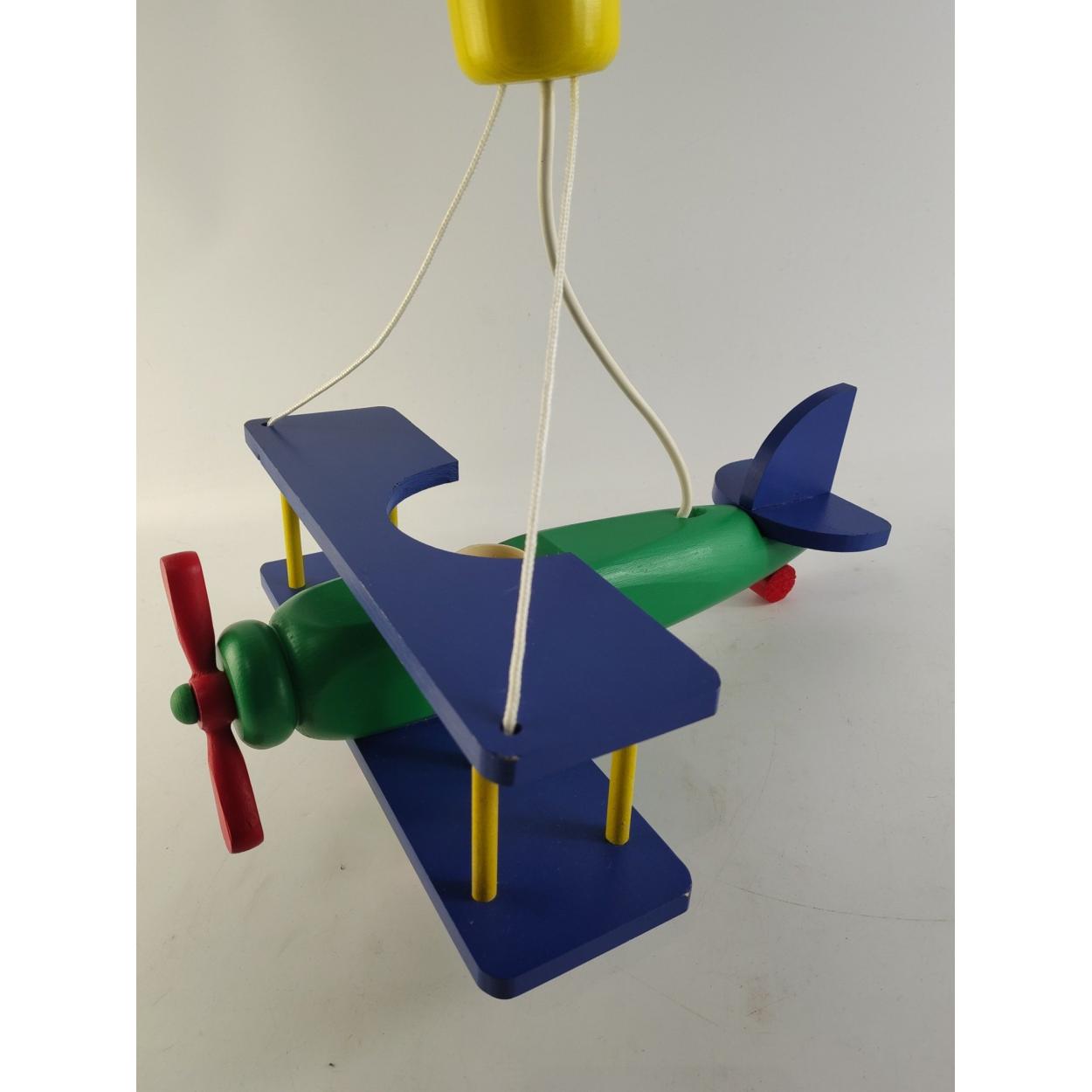 A super child's hanging lamp in the form of a bi-plane. Has a bulb holder set into the fuselage. Wingspan 29cm approx. A colourful and fun piece.