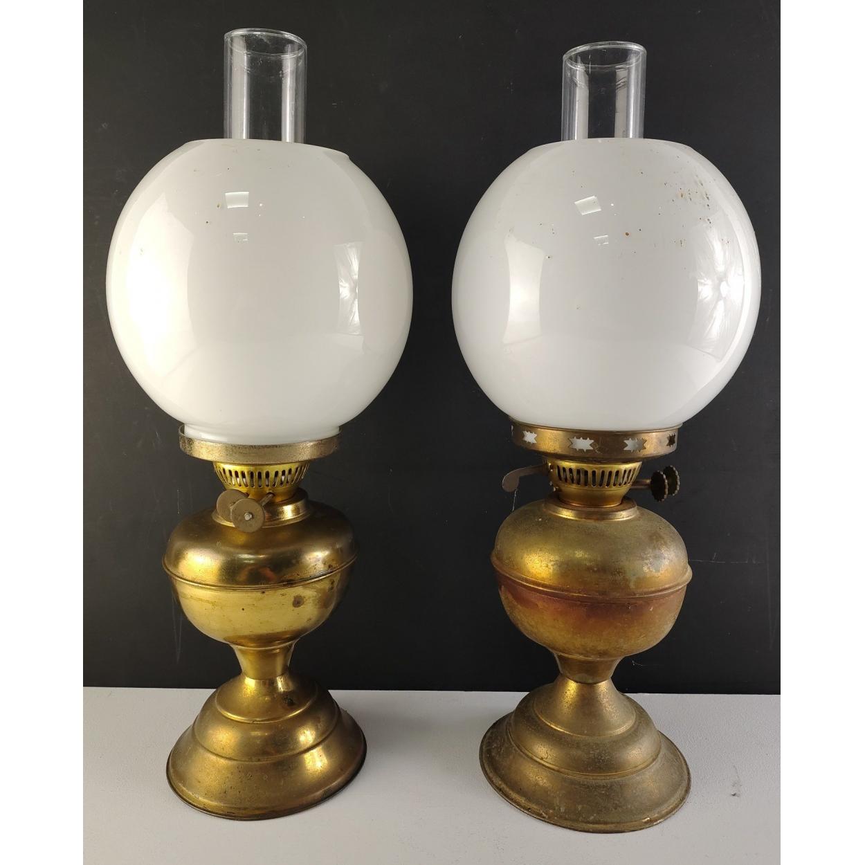 A pair of brass oil lamps with clear undamaged milk glass globes, stand approx 47cm tall