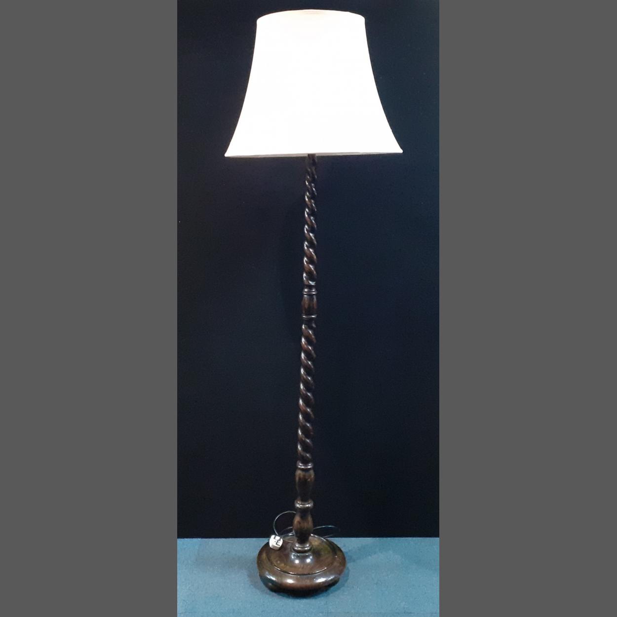 A substantial floor standing barley twist wooden standard lamp with shade. In nice condition. 170cm approx to bulb holder.