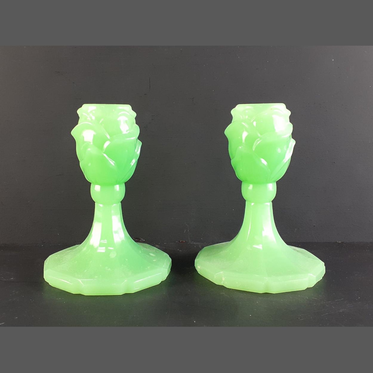VINTAGE - A pair of uranium glass candlesticks 12cm high approx