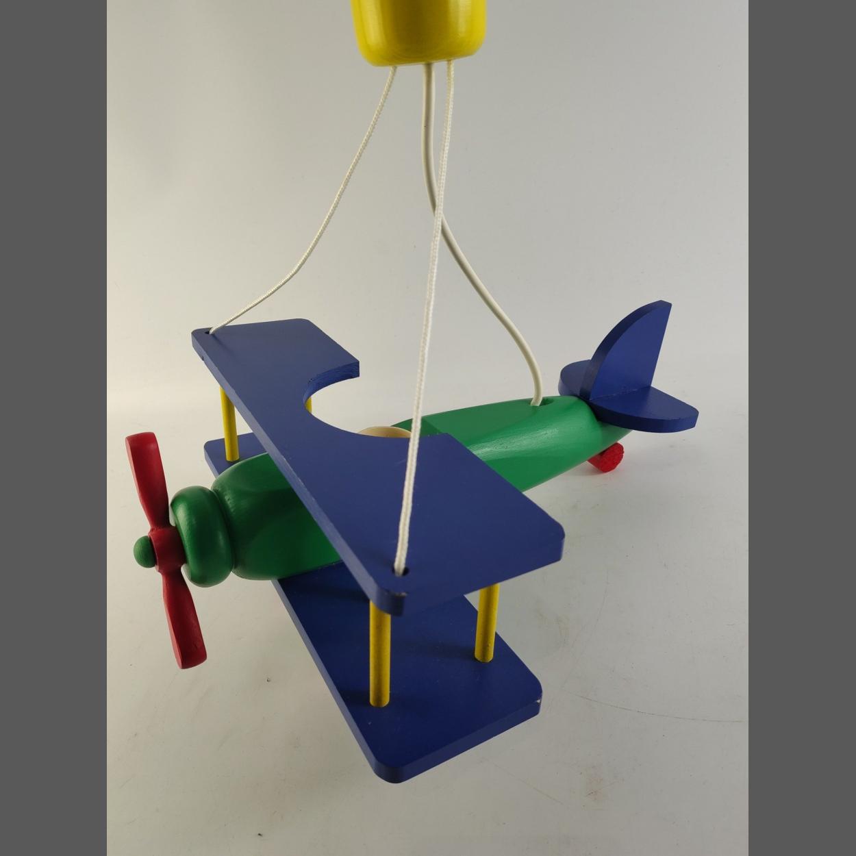 A super child's hanging lamp in the form of a bi-plane. Has a bulb holder set into the fuselage. Wingspan 29cm approx. A colourful and fun piece.