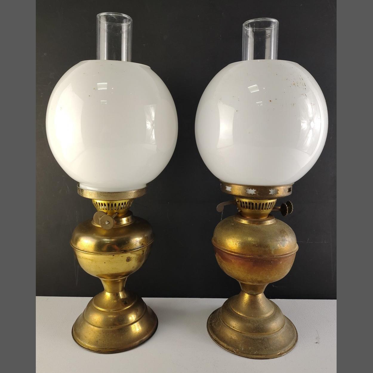 A pair of brass oil lamps with clear undamaged milk glass globes, stand approx 47cm tall