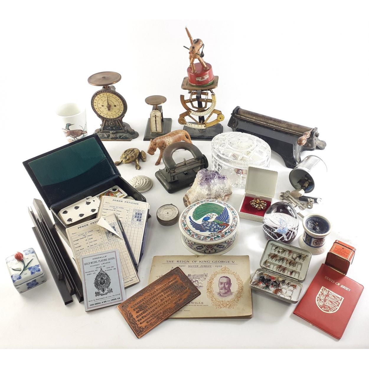 A mixed lot to include a SALTER'S letter balance, a set of bilateral scales, an amethyst geode, a SELKIRK GLASS paperweight, and ELIZABETH ARDEN Byzantium trinket box (12cm approx) and tealight etc.