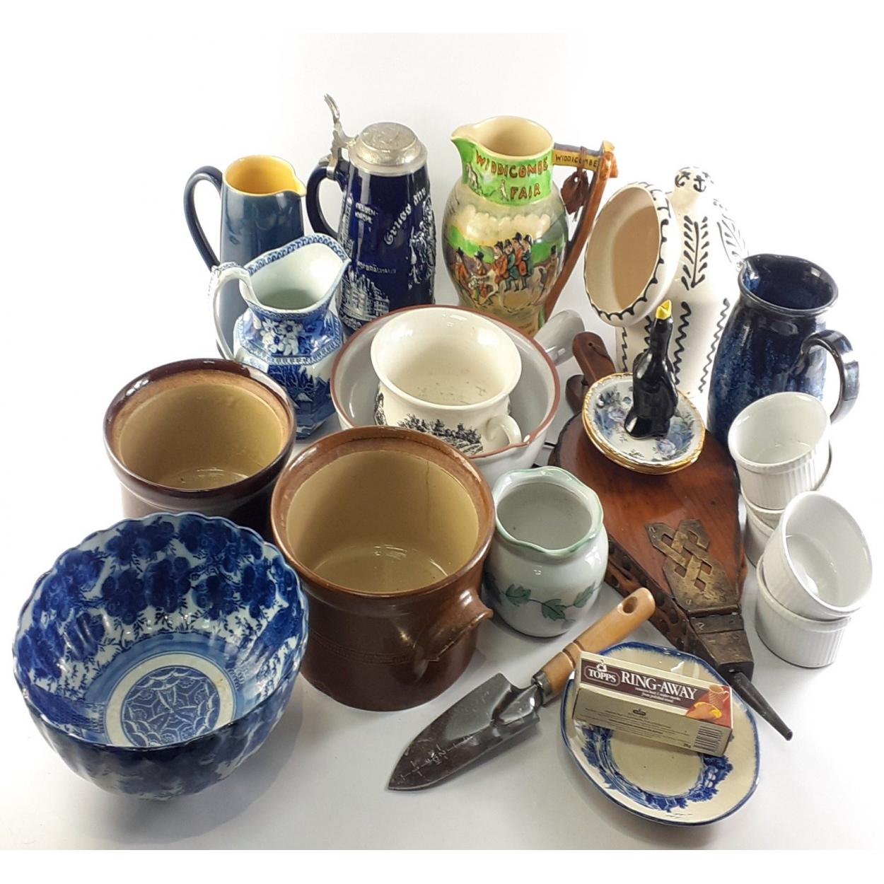 A good mixed decorative useful lot to include stein, Widdicombe Fair musical jug, lots of other ceramics, bellows etc. A good lot.