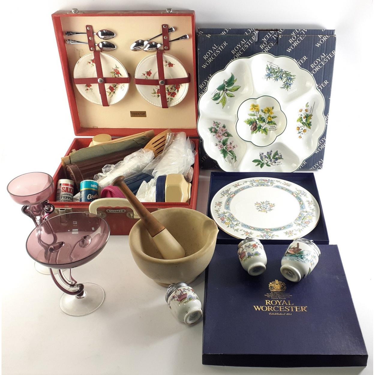 Mixed lot to include mortar and pestle (A/F), ceramic serving dishes, coddlers, glassware (A/F) and a number of picnic items.