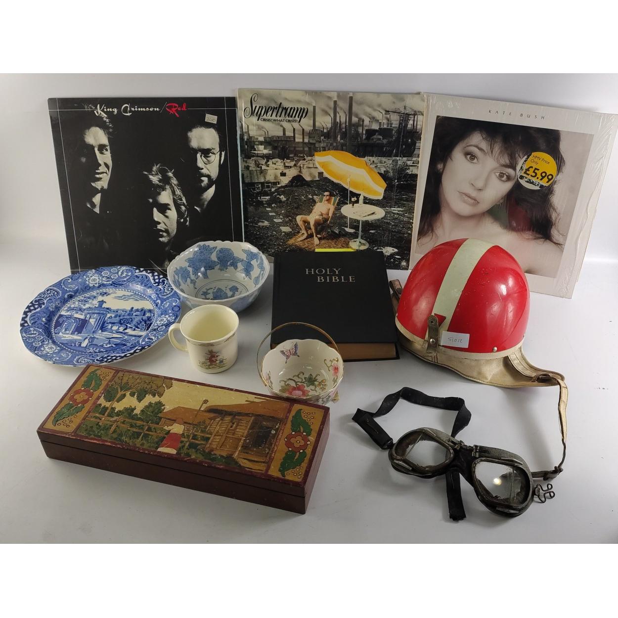 A mixed lot to include a KANGOL vintage motorcycle helmet with goggles, size 4, a wooden box 36 x 14 x 5cm approx, a bible (King James version), 3 LPs KATE BUSH: The Whole Story, SUPERSTRAMP: Crisis? What Crisis? and SUPERTRAMP. Also ROYAL DOULTON Bunnykins and some blue and white china