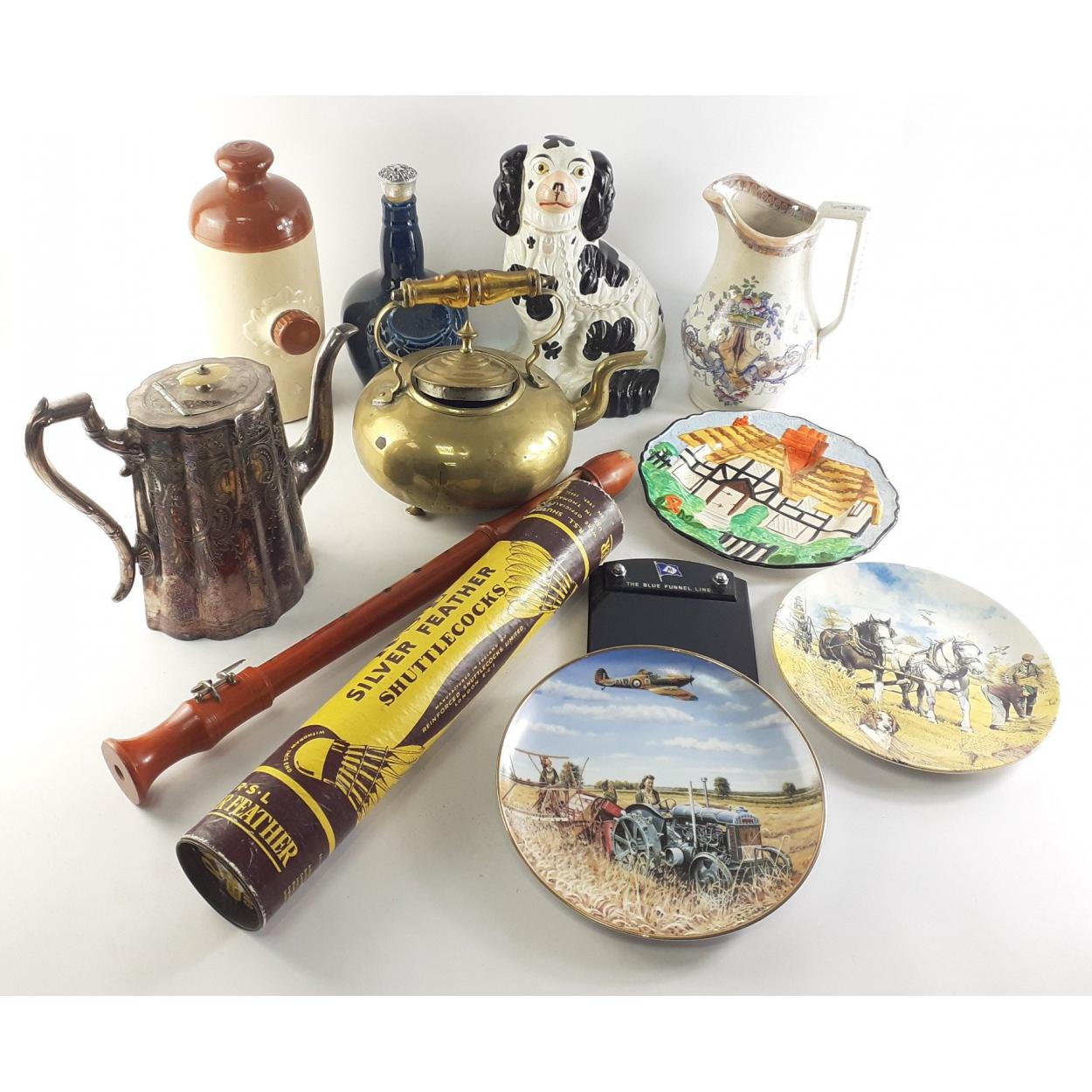 A mixed lot to include a SPODE liquor bottle, one Wally dog, stone pig water bottle, brass kettle, pack of shuttlecocks etc.