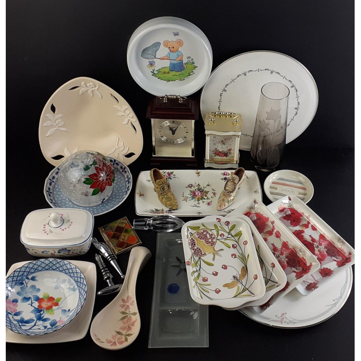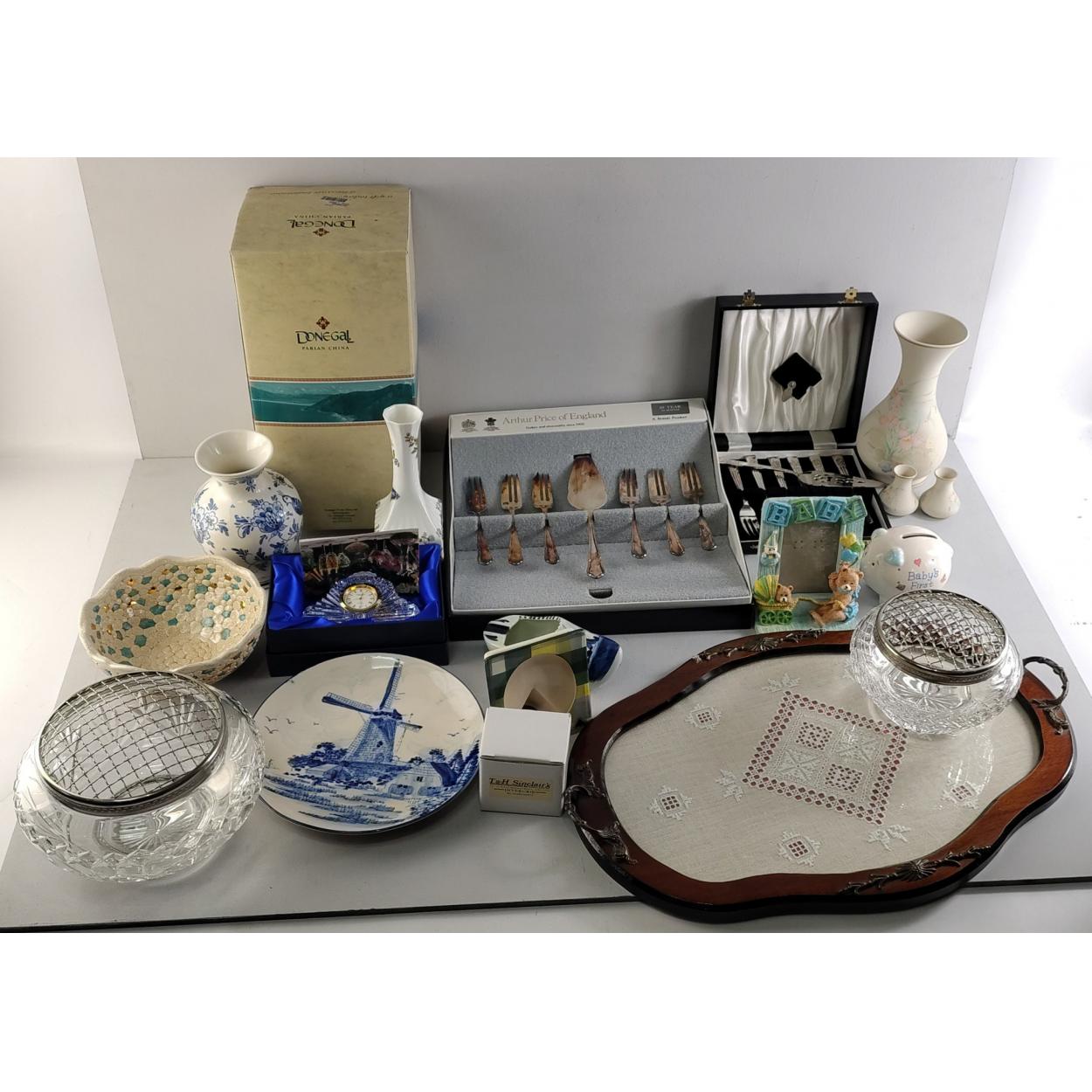 A good mixed decorative lot to include boxed Donegal Primrose vase, a linen tray, small Tipperary crystal clock, plated flatware, Delft pieces and much else.