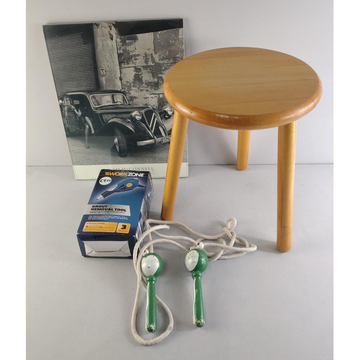 A wee box of odds, to include a super photographic print of a Citroen Traction Avant, a handy small milking stool, and a Workzone grout removal tool.