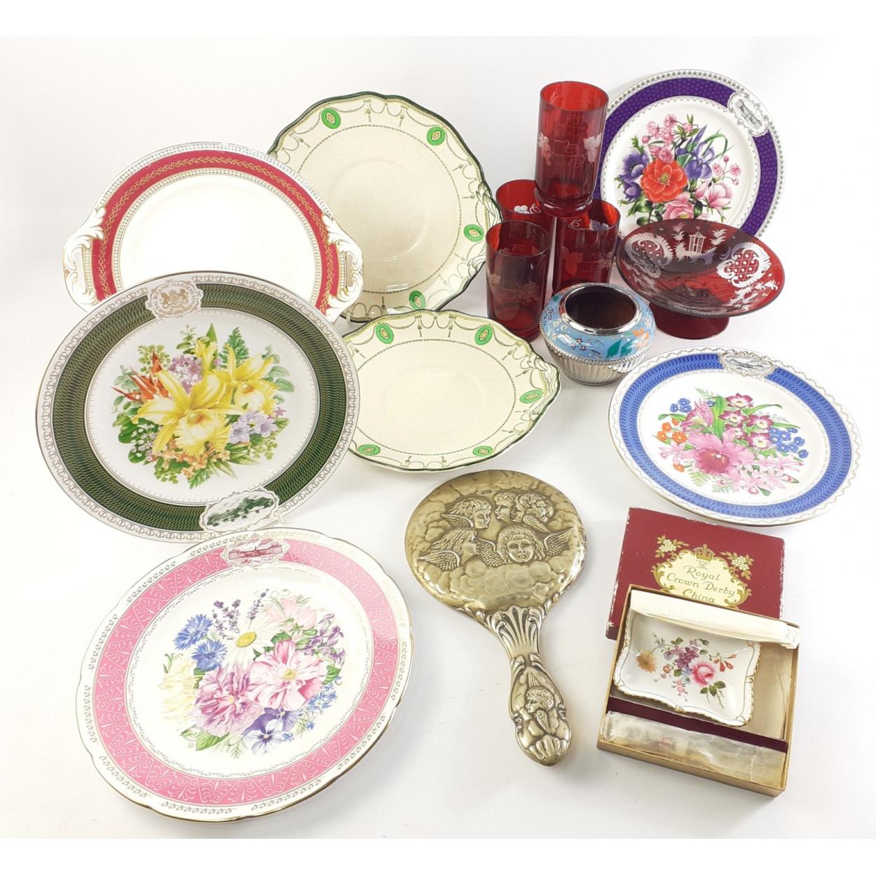 Mixed decorative lot to include four Royal Horticultural Society plates, two Royal Doulton Countess plates, Four Cranberry Glass tumblers and a similar compote.