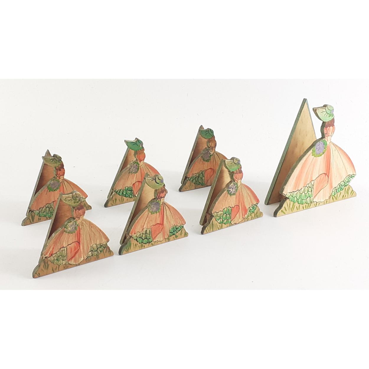 A pretty small set of wooden menu / serviette holders in the form of classic ladies.