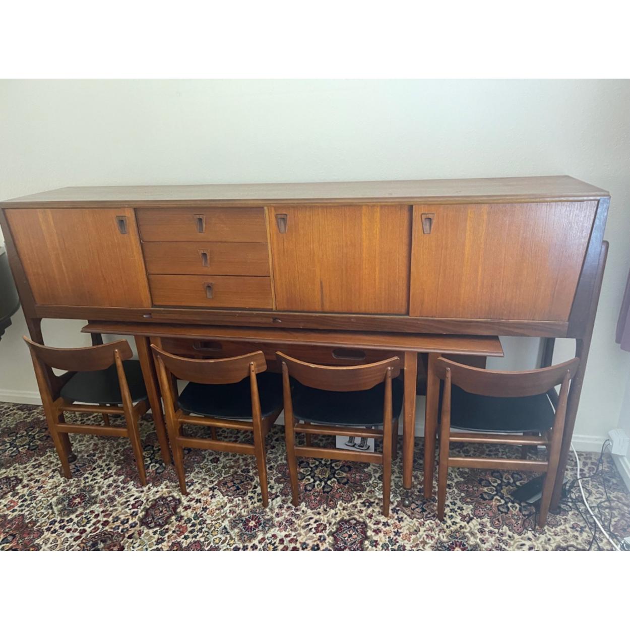 A c1970 RETRO raised sideboard and fold-away (under the sideboard) dining table and four chairs - sideboard is 8ft long x 5ft height approx