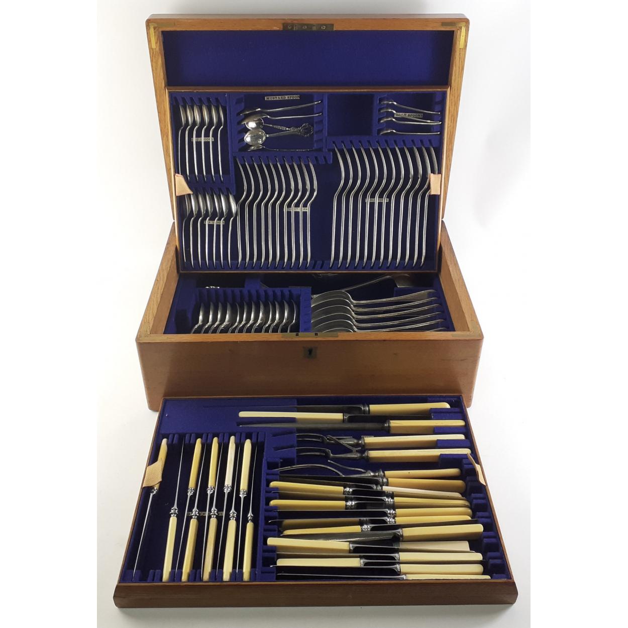 A large canteen of plated cutlery in wooden presentation display box, three drawers. All in good useable condition