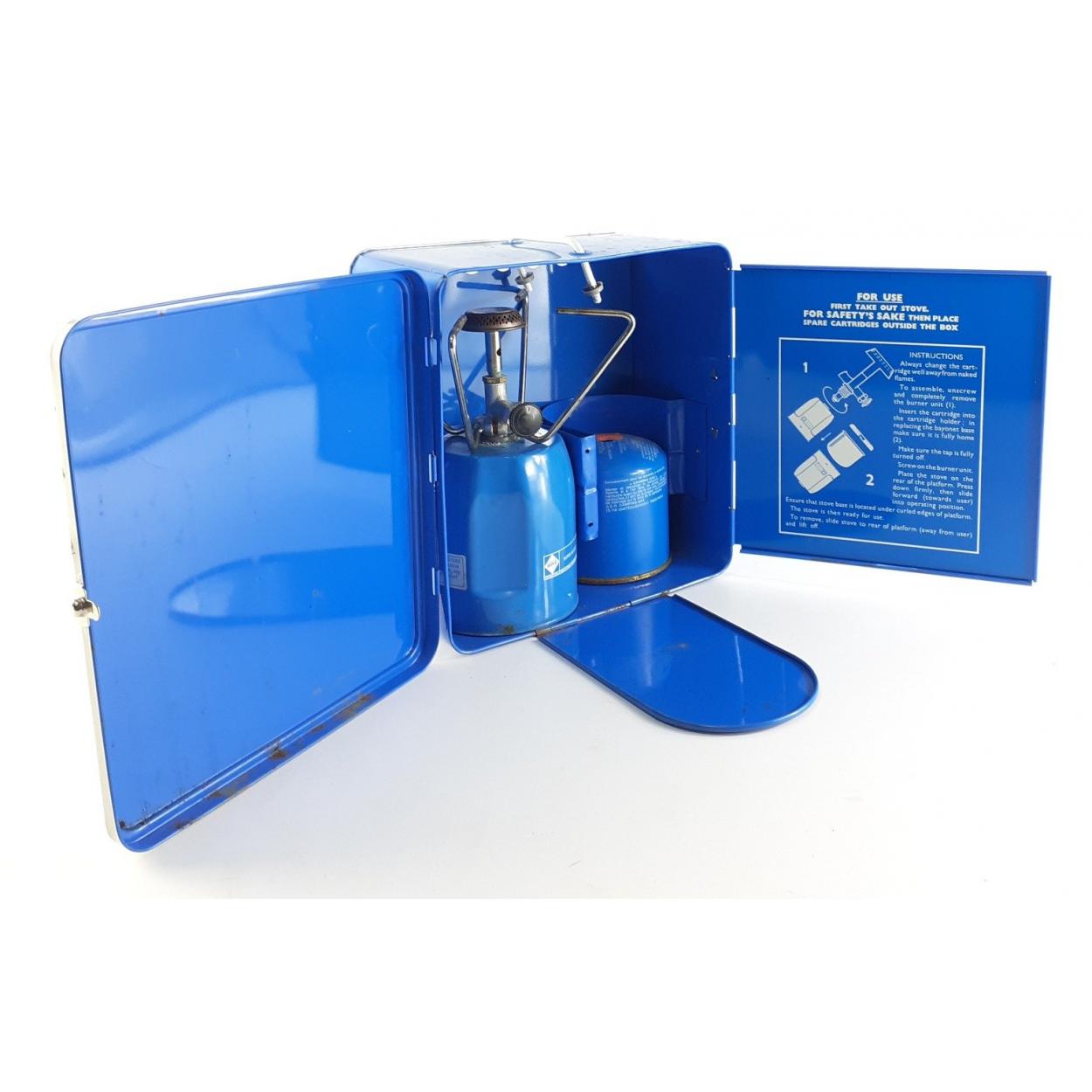 A CAMPING GAZ International de luxe super bluet camping stove in a tin container. Comes with gas bottle.