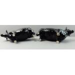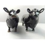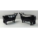 A BESWICK Aberdeen Angus bull and cow, 19cm long approx, both with bottom stamp saying "Approved by the Aberdeen Angus Cattle Society" in gold lettering, both in excellent undamaged condition