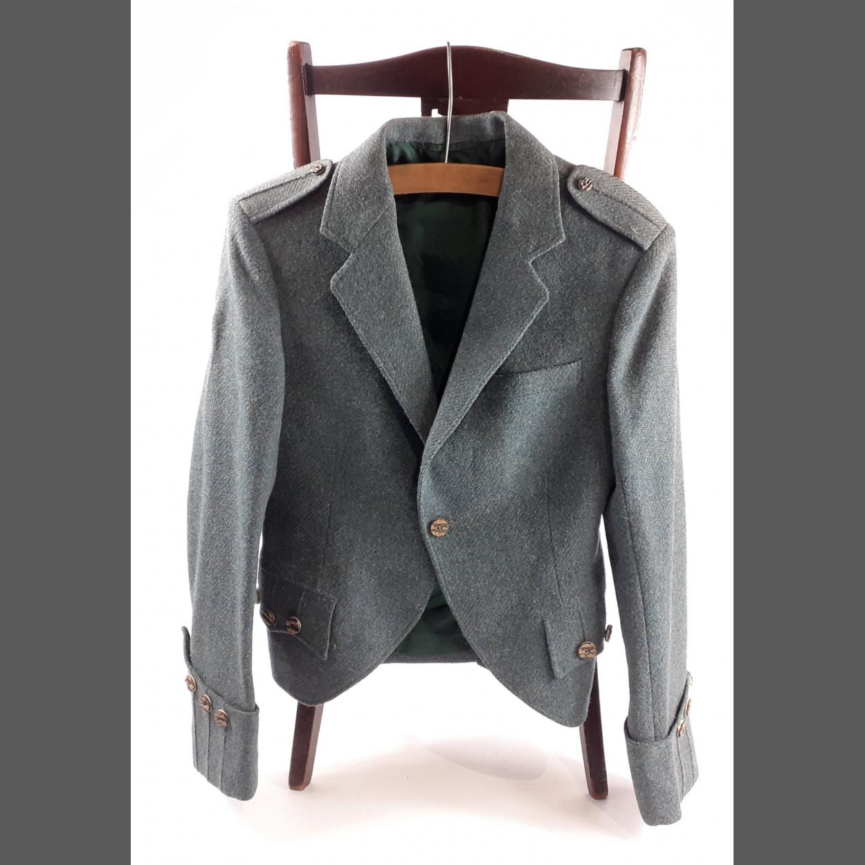 A gent's tweed jacket in lovat blue fastened with 1 horn button made by MOSS BROS, size 36"