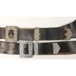 A thick black leather drum harness with white metal buckles and thistle motifs length 56" approx, and a black leather flagpole carrying belt with white metal buckles with thistle motifs approx 42-50"