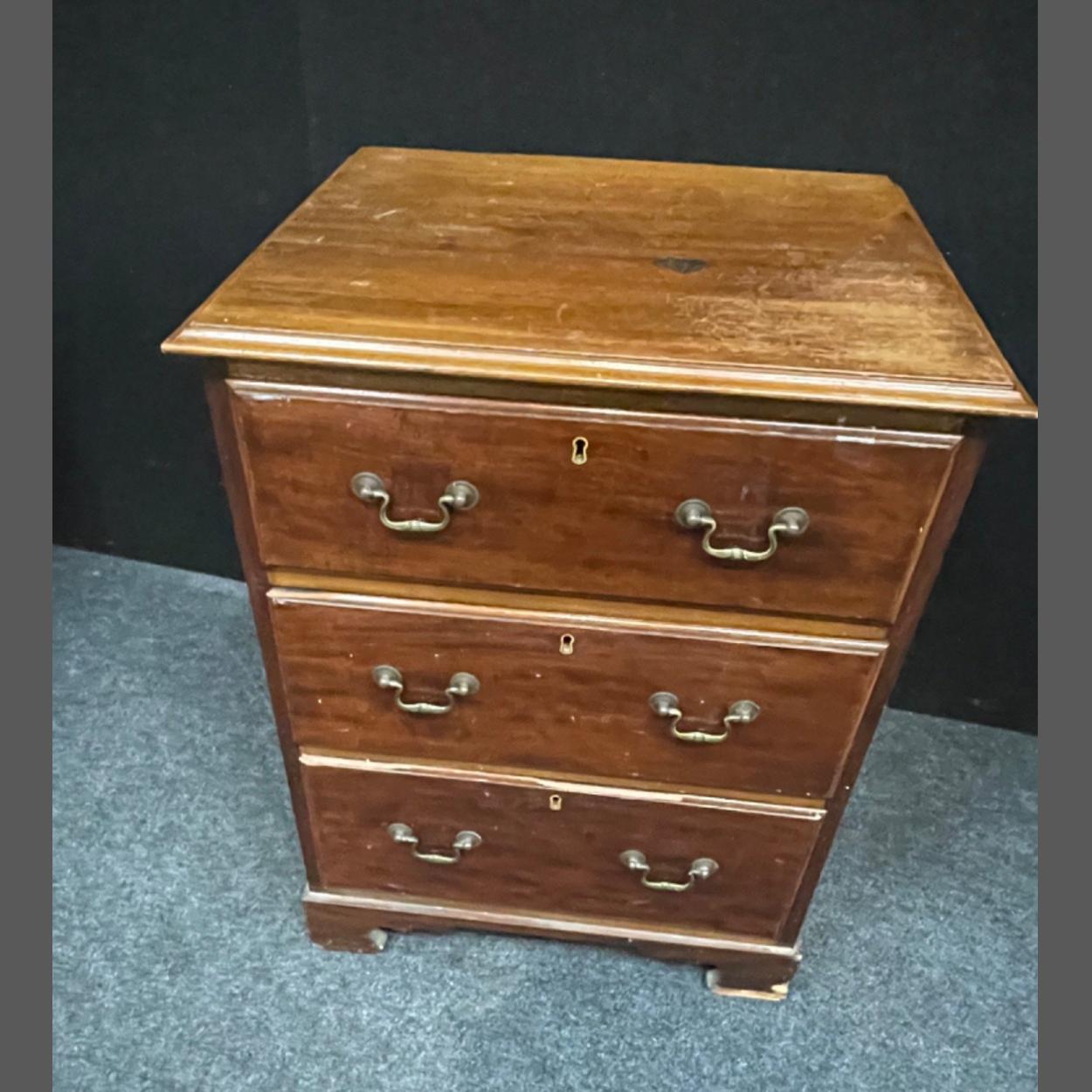 A sturdy three drawer bedside set of drawers with original handles - 18" across x 12" depth x 2ft height approx