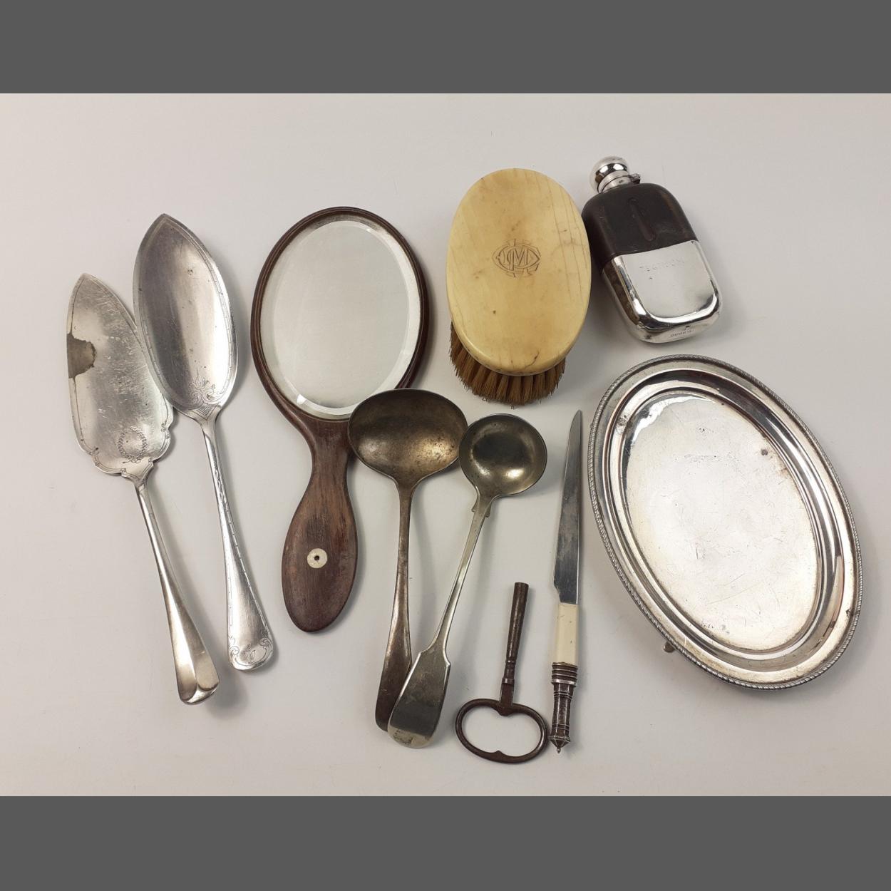 A collection of items of interest to include, some flatware, EP flask, brush, mirror. Some interesting pieces.