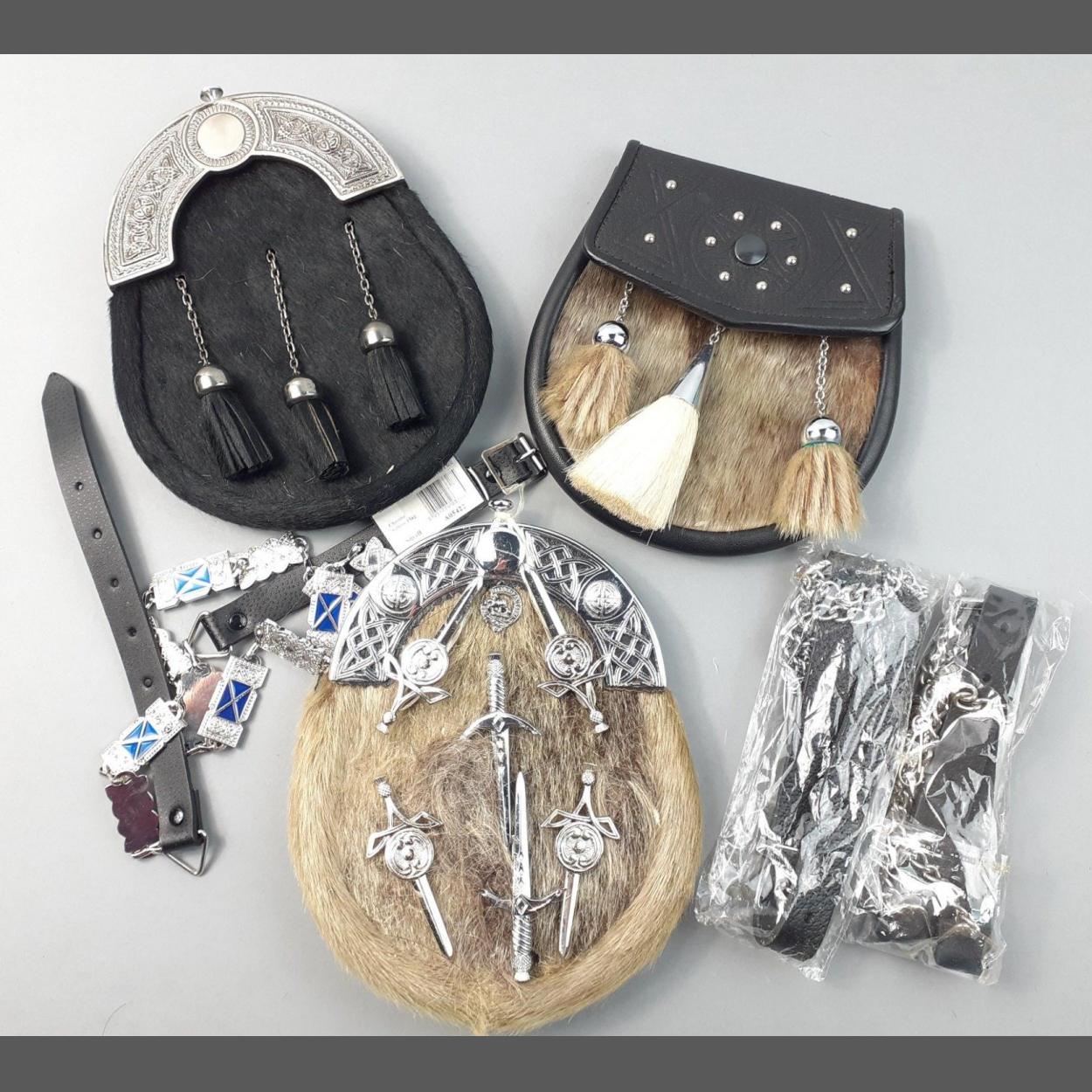 Three semi dress sporrans, one with a saltire belt, the others with new belts