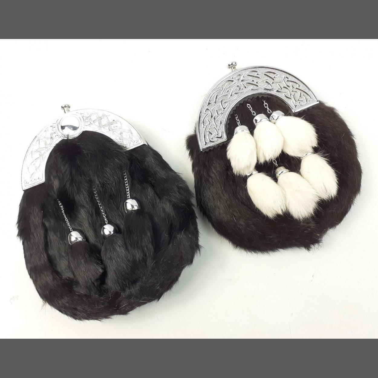 A black fur dress sporran with 6 white tassels and belt, and one other black fur dress sporran with belt
