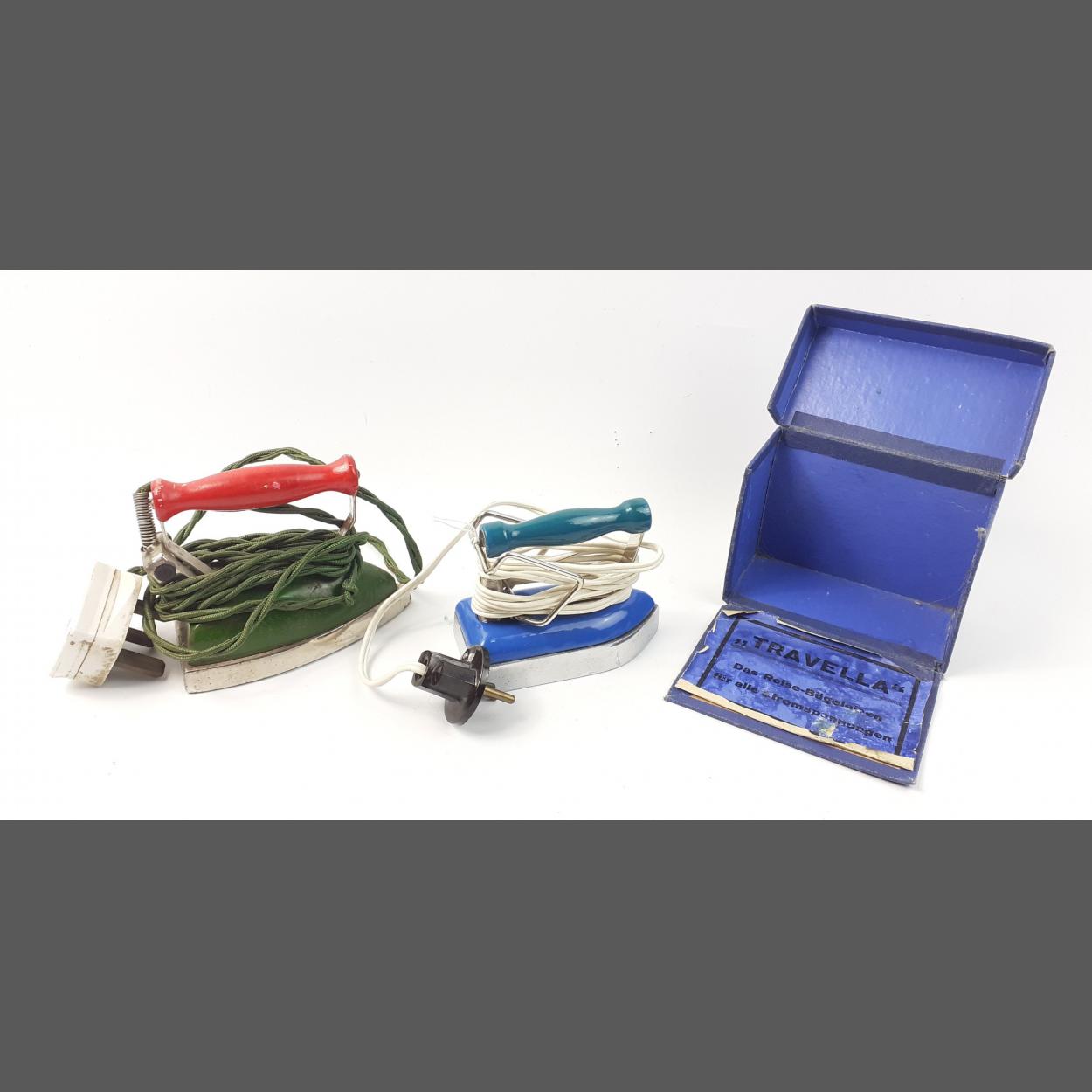 Two petite vintage travelling irons, one in a box called the TRAVELLA and one other