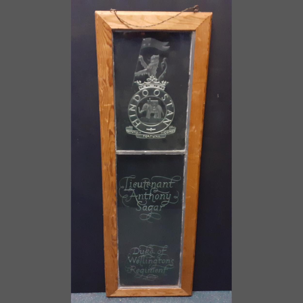 DUKE OF WELLINGTON REGIMENT - a unique piece of historical interest relating to Lieutenant Anthony Sagar. A very expensively produced etched and cut glass commemorative panel mounted in lead with a later frame, possibly a commemorative window from a chapel. The Hindoostan crest alone is stunning, frame size 112x37cm approx