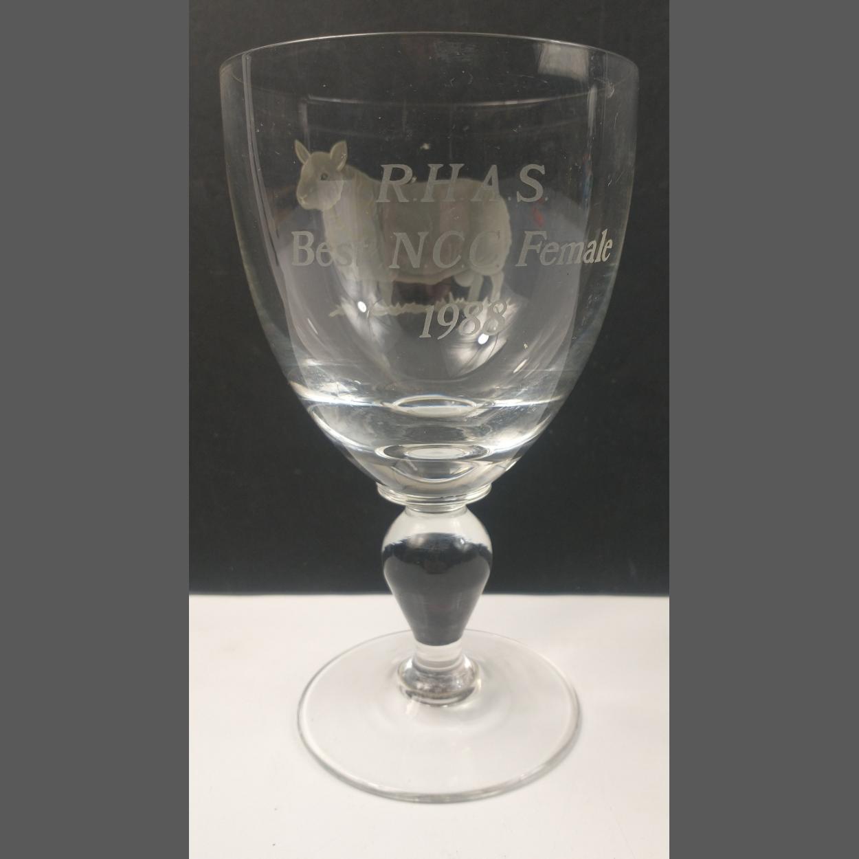 A rather lovely etched goblet of agricultural interest, engraved RHAS Best N.C.C. Female 1988 with a delicately engraved sheep