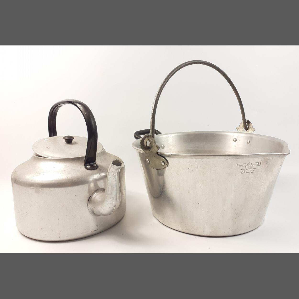 A VINTAGE aluminium jelly pan 32cm dia, large kettle, both in good condition