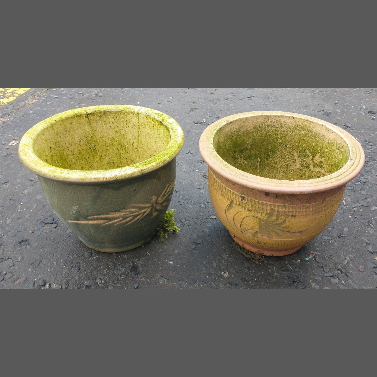 Two smaller garden pots. One with green design other in light brown W24 x H19 x D24cm approx