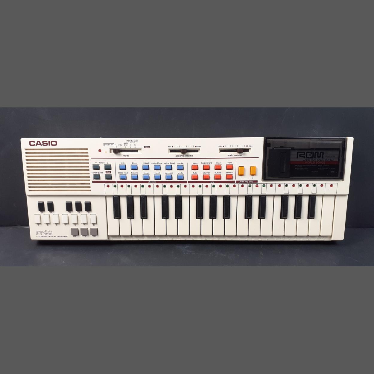 A CASIO PT-80 electronic musical instrument in good playing order. Comes with a ROM pack inserted.