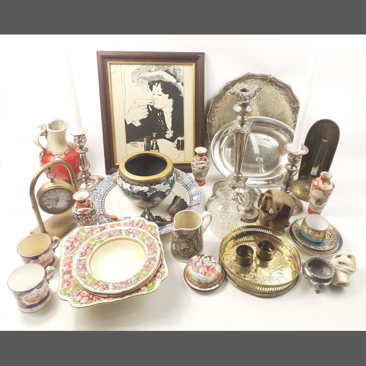 A mixed lot to include some silver plated items, a substantial single candlestick, a brass candle night stick, a modern clock on a brass stand, a German style vase, a carved elephant and a nice framed Toulouse Lautrec style black and white sketch and others
