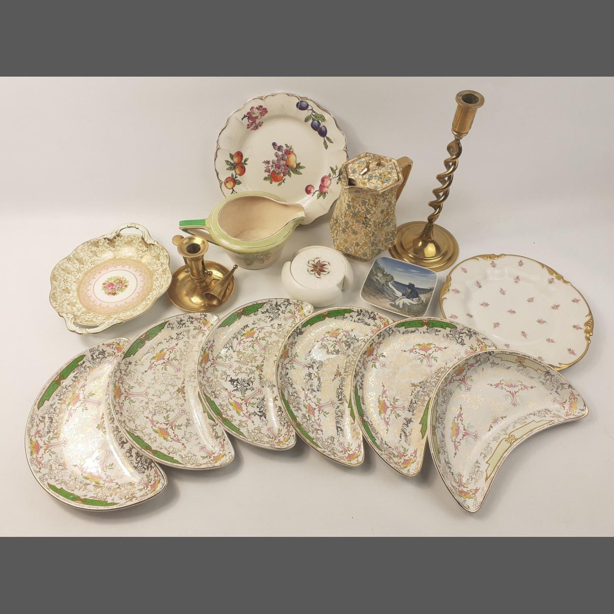 A mixed lot to include 6 crescent salad plates, 3 plates including one by George Jones, a ROYAL COPENHAGEN pin dish, a rather lovely ROYAL WINTON floral milk jug with lid, a marble coaster set, and 2 brass candlesticks