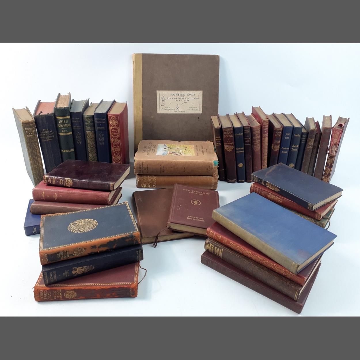 A collection of small sized (17x11cm approx) vintage CLASSIC BOOKS, including works by Scott, Hardy, Stevenson, Bronte, Hugo, Dickens, Eliot, many leather covered