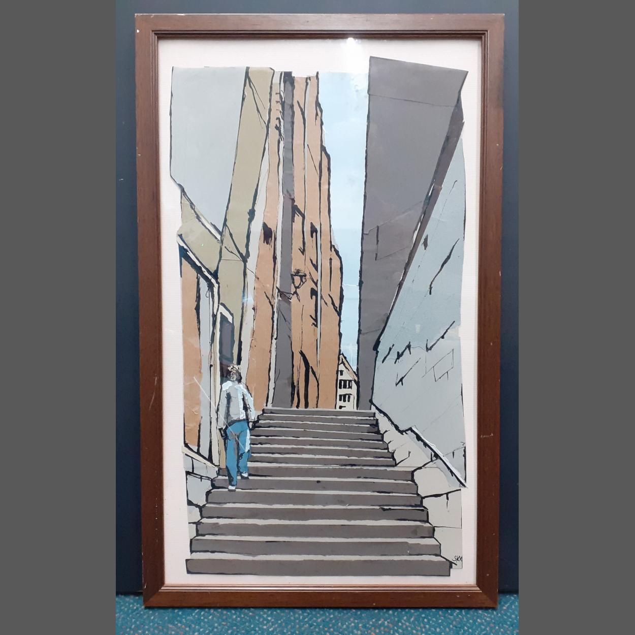 SARAH KEER-KEER. Fleshmarket steps, Edinburgh, 2007. A wonderful original collage made from various pieces of paper depicting this great Edinburgh scene. 68 x 41cm approx. A unique and wonderful piece.