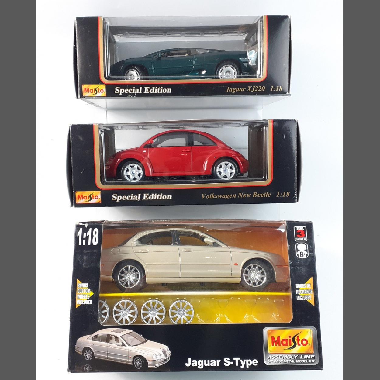 Three boxed diecast vehicles comprising a MAISTO Jaguar XJ220, and a VOLKSWAGEN New Beetle as well as a MAISTO Jaguar S-type from the Assembly Line series