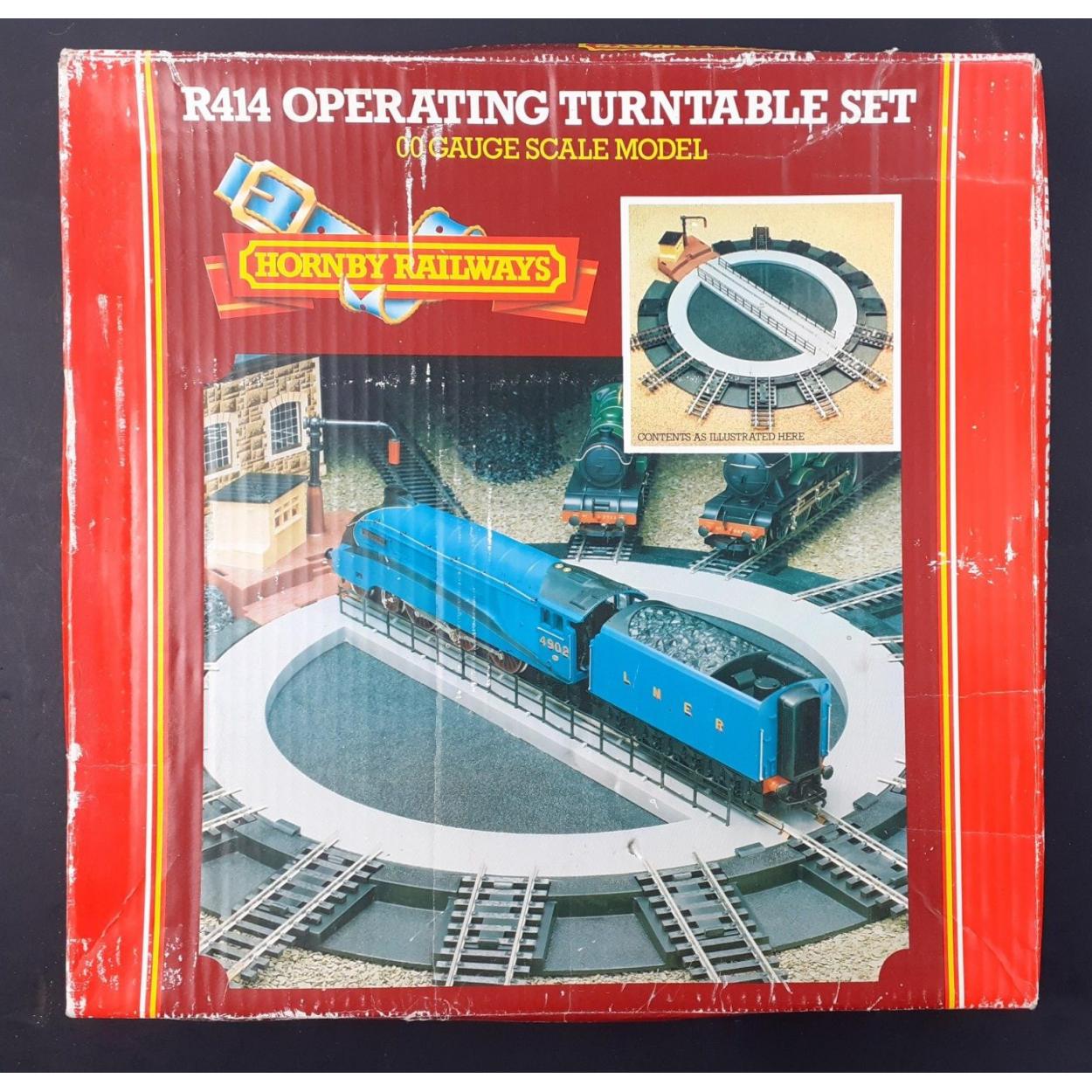 A boxed HORNBY R414 operating 00 gauge model railway turntable set. Box with wear