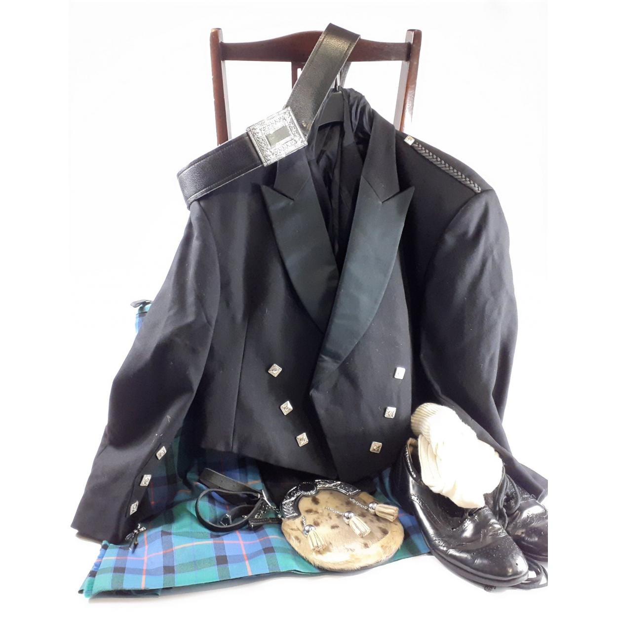 A complete gent's Highland outfit to include a pure new wool Flower of Scotland tartan kilt, waist 44" x 24" length, with sword shaped kilt pin, pure new wool formal jacket 48" chest with waistcoat, leather belt, semi-formal sporran, kilt hose, size 10 Highland dress shoes, all in lovely clean condition and presented within a suit bag