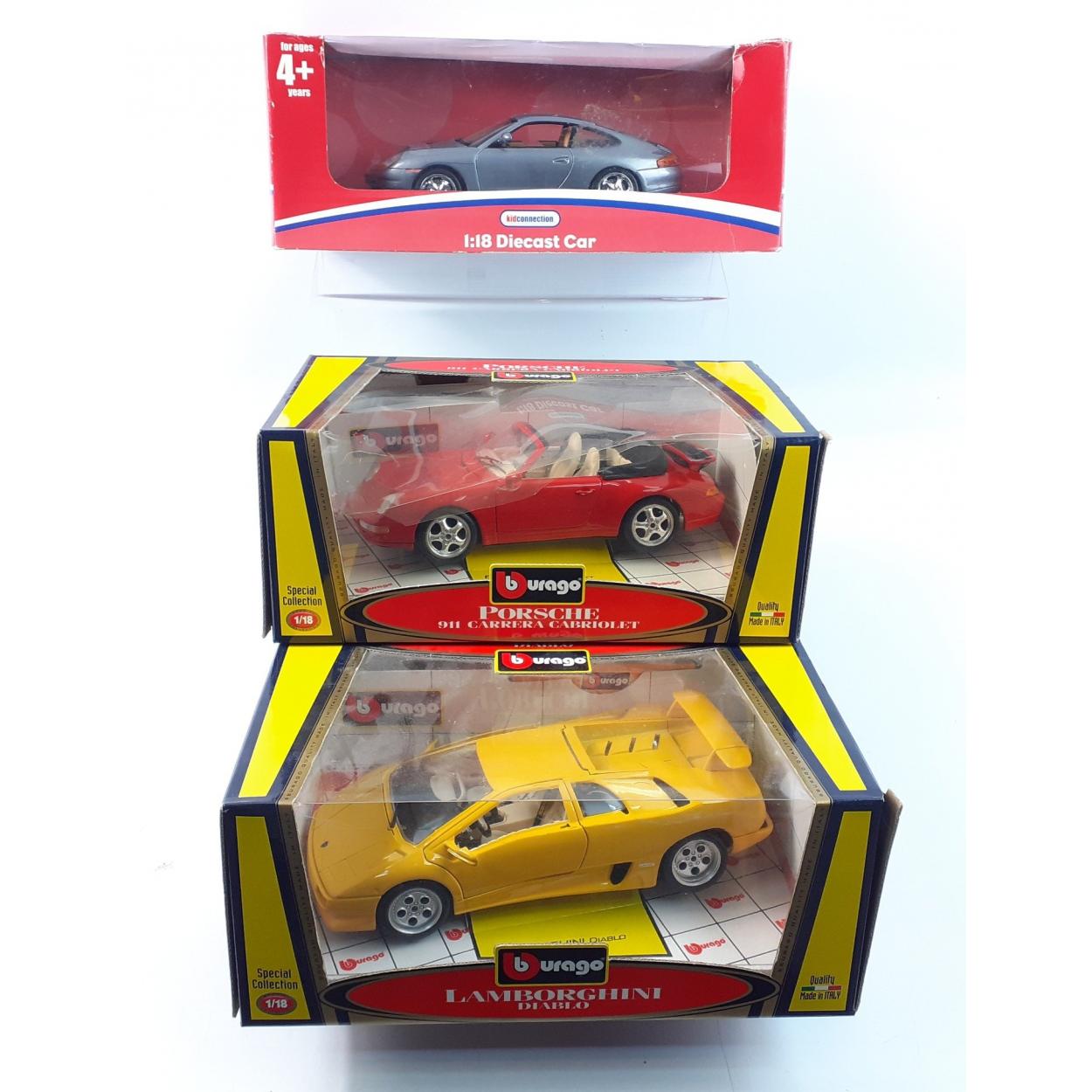 A 1:18 scale die cast lot of 3 models to include KID Connection PORSCHE, a BURAGO 911and a LAMBORGHINI Diablo