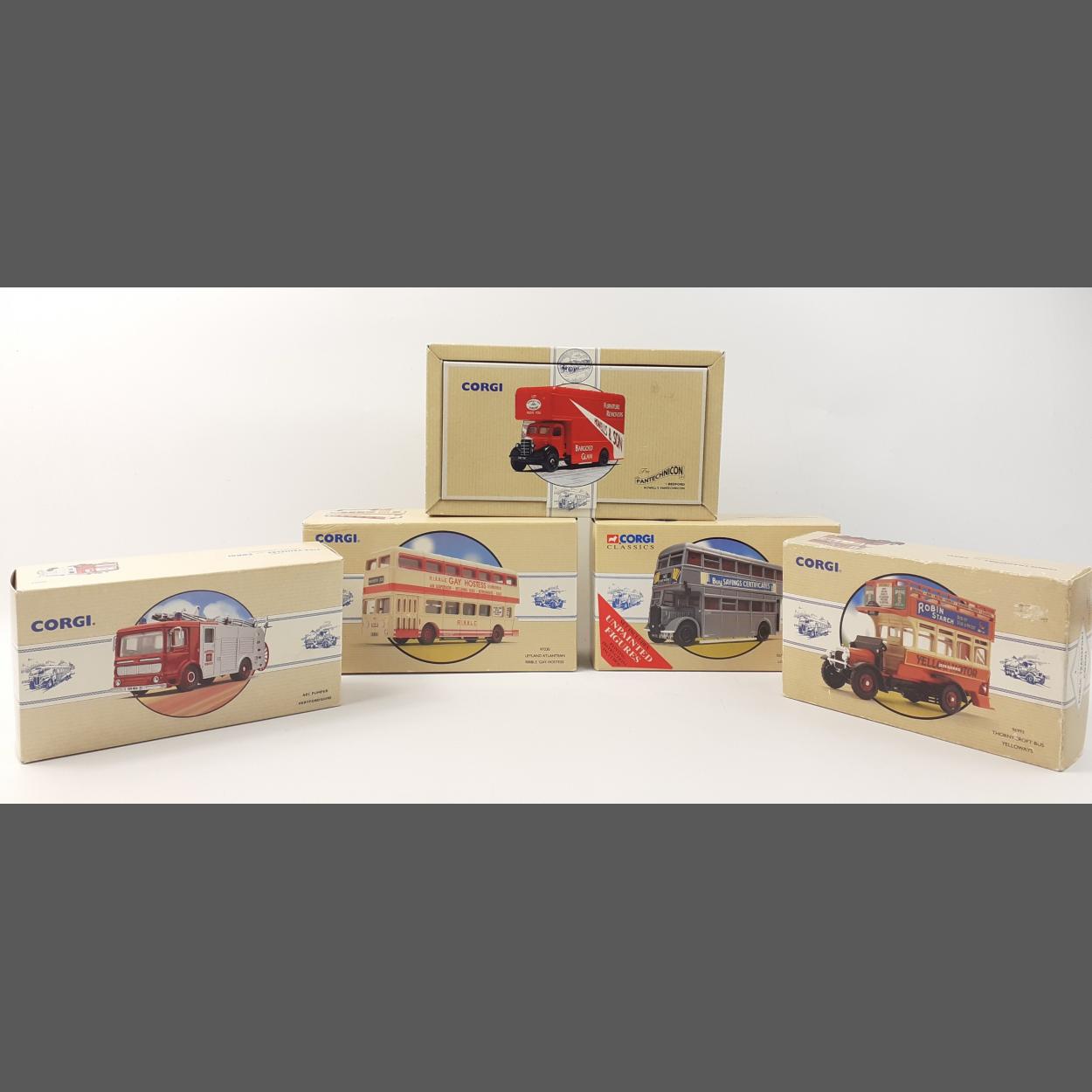 A collection of CORGI models to include 97915 the Bedford Pantechnicon, 97230 Gay Hostess, 97315 Guy Arab, 97357 AEC Pumper, 96993 Thornycroft